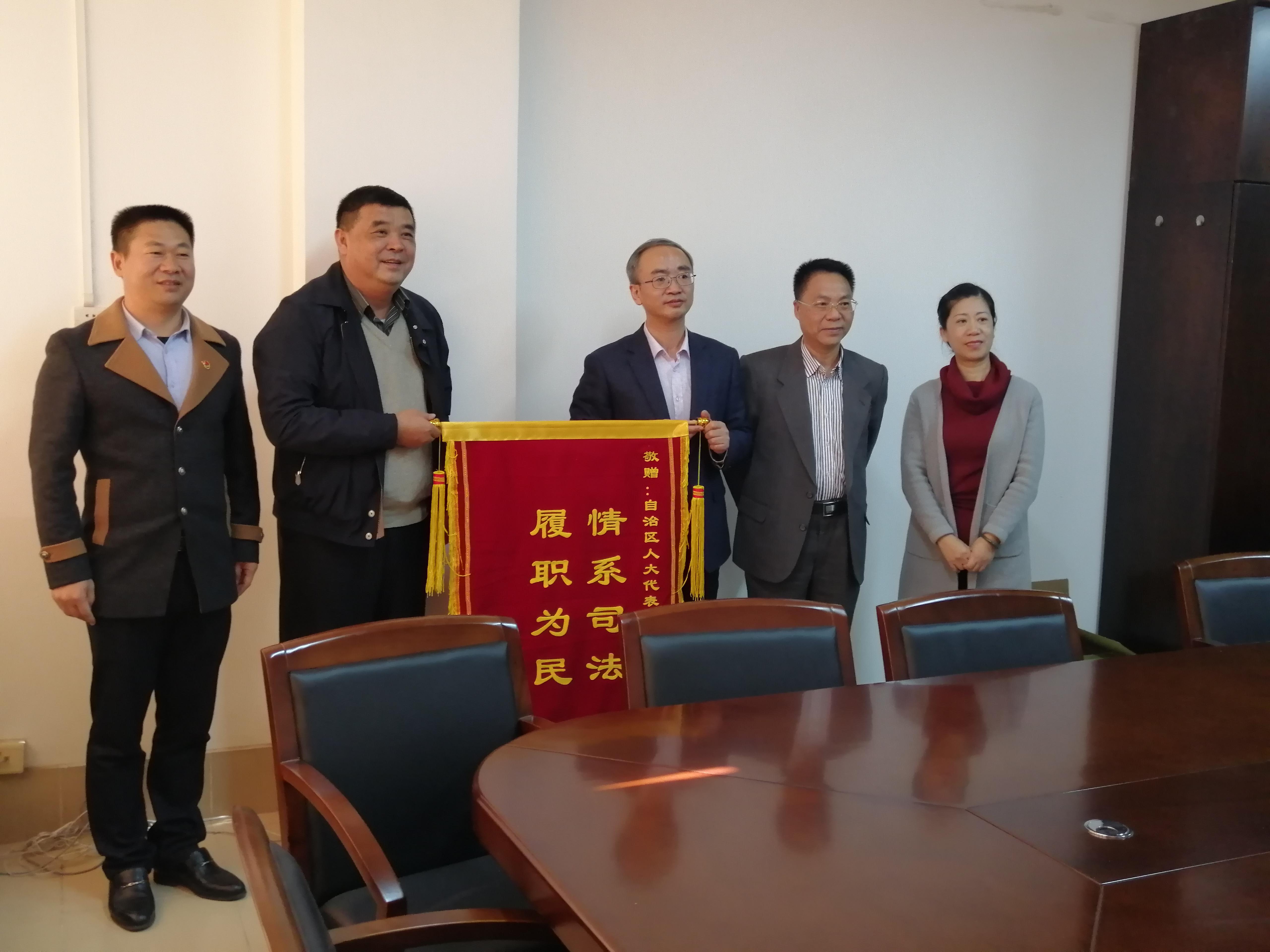 该建议目前大部分已得到落实,我区基层司法所特别是贺州市省际边界司法所的基础设施得到极大改善。126月,贺州市司法局局长黄伟东一行3人专程到beats365(中国区)-唯一官方网站为李晖同志送上“情系司法 履职为民”的锦旗,感谢李晖对基层司法的关心。