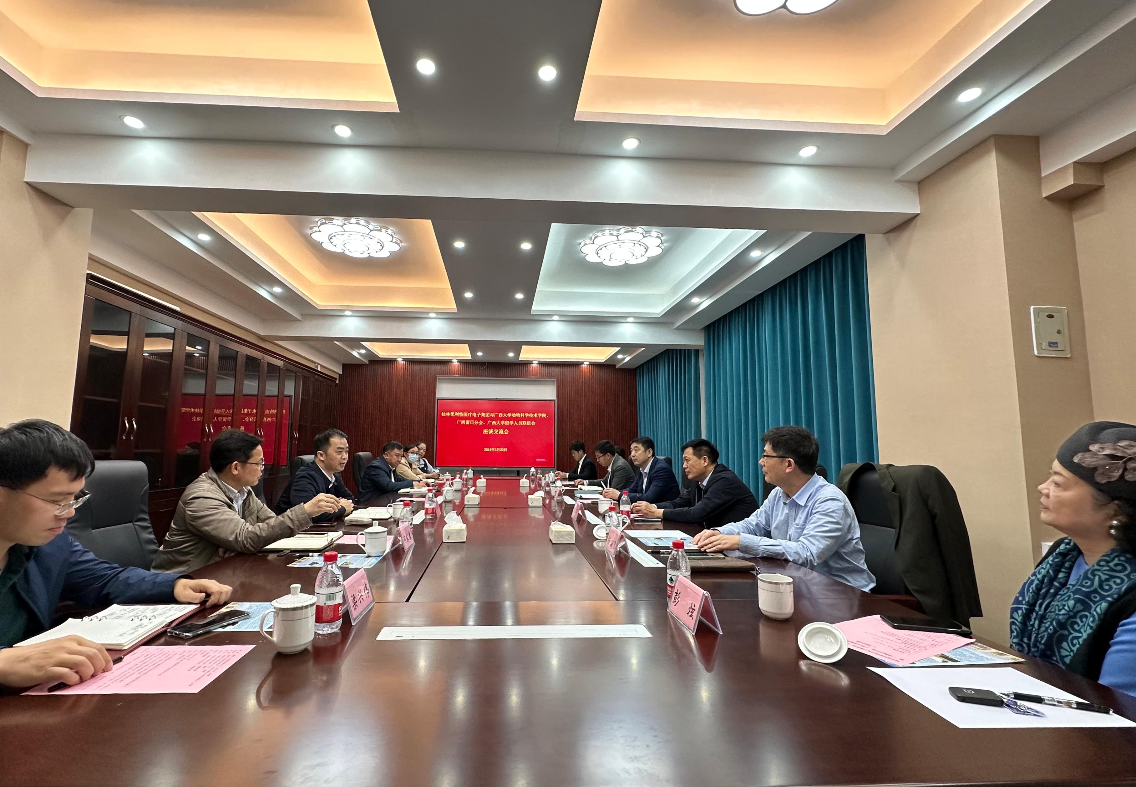 为进一步服务广西龙头企业,促进高层次人才与企业开展科技成果转化、助推企业转型升级,3月22日上午,我校统战部和留联会海归专家团动物科技服务团(动科学院)在君武馆接待了桂林优利特医疗电子集团一行来访,并在二楼会议室召开了以“产教合作、人才培养”为主题的校企合作座谈会。动物科技服务团团长、动科学院院长陆阳清教授及副院长何家康教授,留联会副会长、电气工程学院院长武新章教授,桂林优利特考察团和广西欧美同学会留日分会领导等二十余人参加了座谈交流。