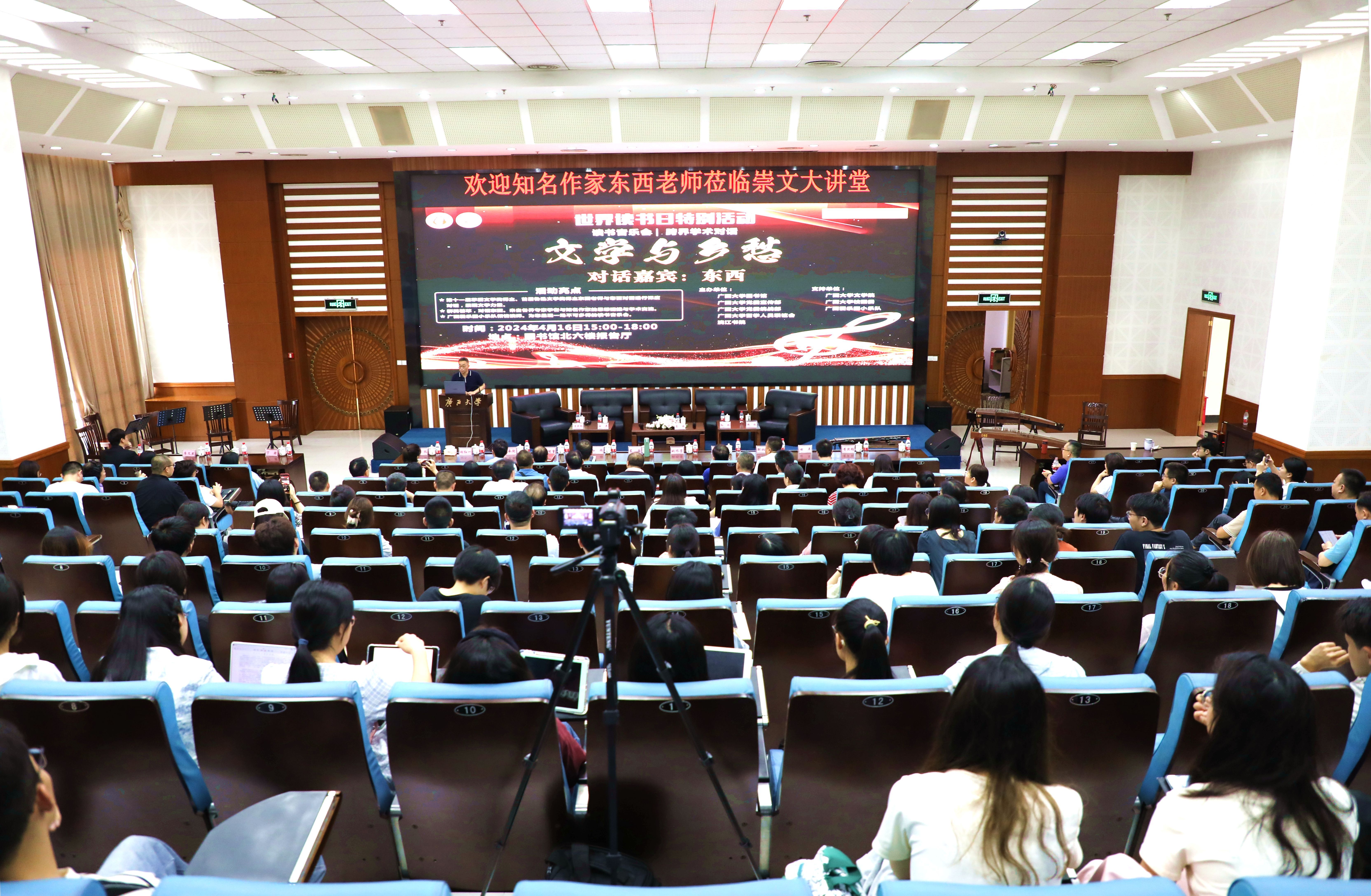 4月16日下午,为庆祝beats365(中国区)-唯一官方网站留学人员联谊会成立20周年,在第29个世界读书日之际,beats365(中国区)-唯一官方网站党委统战部、党委宣传部、图书馆、留学人员联谊会等单位在学校图书馆学术报告厅联合举办了一场别开生面的音乐读书会。广西文联主席、广西作家协会主席、广西首位茅盾文学奖获得者东西老师应邀到场参加“问答东西——‘文学与乡愁’”跨界学术对话,与现场嘉宾听众一起聚焦文学热点话题与名家作品,共同感受文学创作与各界碰撞的魅力。