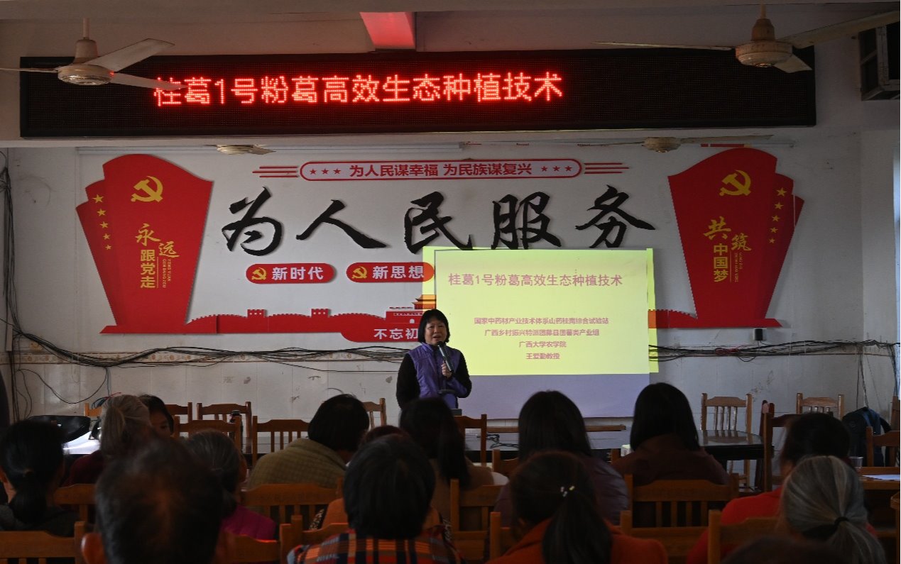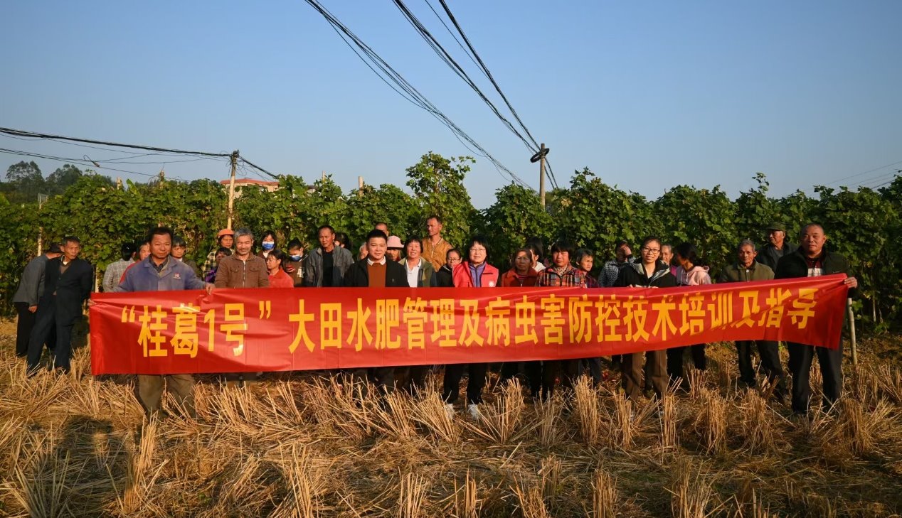 期间,王爱勤教授向和平镇新良村的葛农详细介绍了她选育的“桂葛1号”粉葛特性及其高效生态种植、矮化修根剪枝、病虫害防控等技术。培训结束后,专家们来到田间地头查看粉葛病虫害的发病症状,指导学员防控措施,同时展示粉葛矮化修根剪枝技术,为促进和平镇粉葛品种进行更新换代,推广粉葛组培苗,提高粉葛质量和产量,以及进一步提升藤县广大民众的粉葛高效生态栽培技术提供了技术支持!