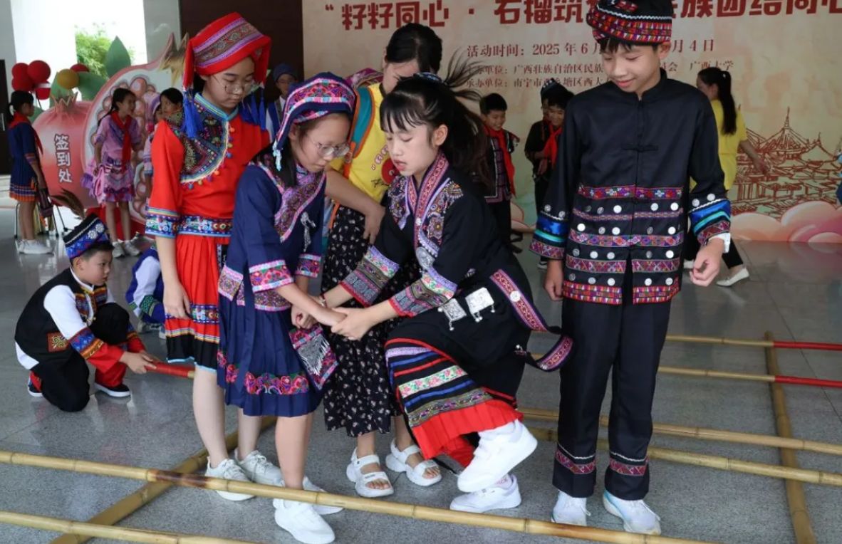 来自柳州市三江侗族自治县民族实验学校、贵港市平南县平南街道中心小学、河池市金城江区第三小学、崇左市江州区第一小学,以及南宁市西乡塘区西大君武小学5所学校的60余名各民族师生组成的民族团结同心营,他们手拉手、心连心,一起感受中华优秀传统文化的魅力,在夏天体验不一样的研学营风情。大家纷纷表示,会珍惜此次机会,全身心投入夏令营活动当中,在研学中接受历史和文化的熏陶,在体验中提升技能和知识水平,争做一粒发光、发热、为铸牢中华民族共同体意识作出青春贡献的“小小石榴籽”。