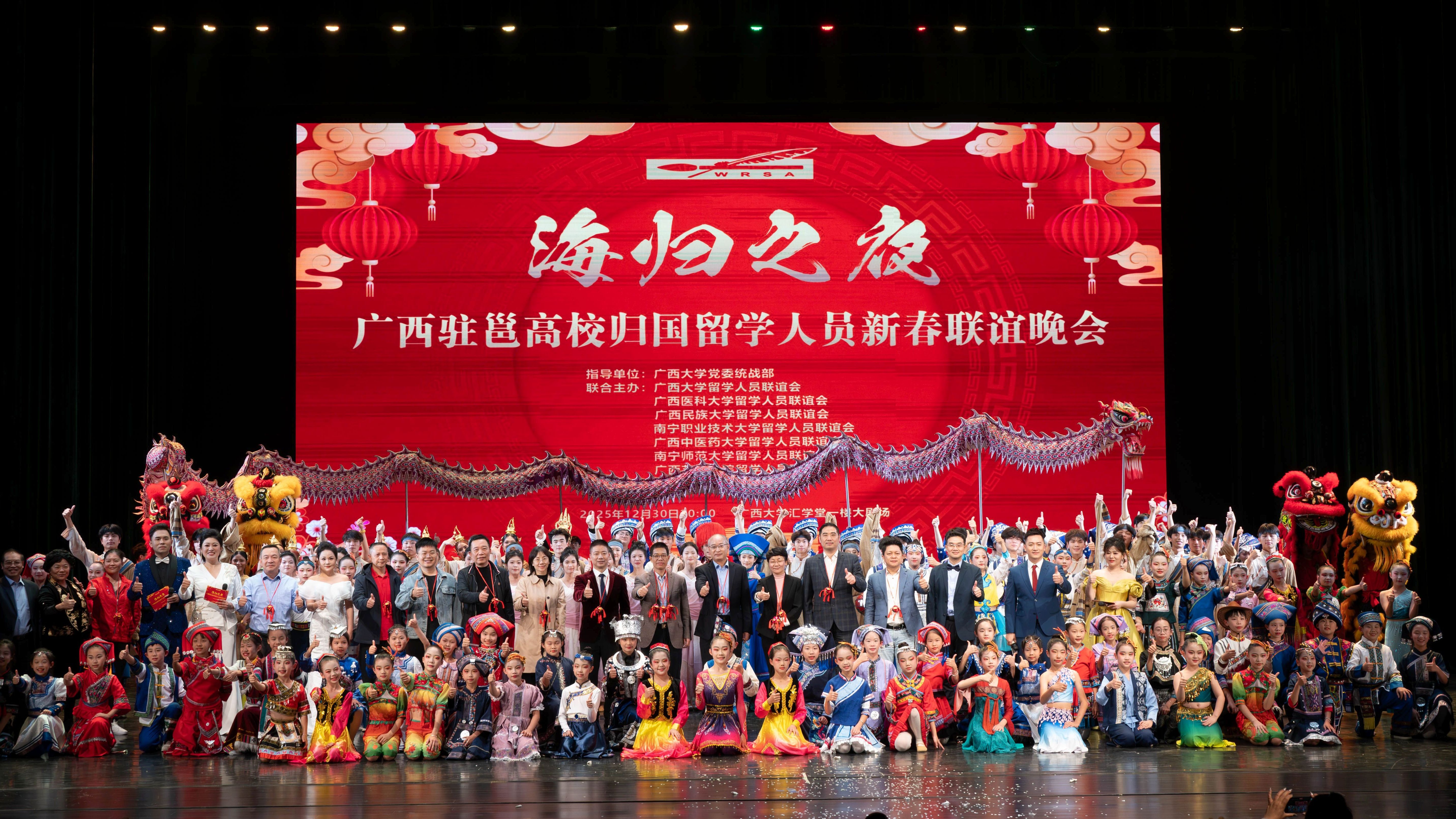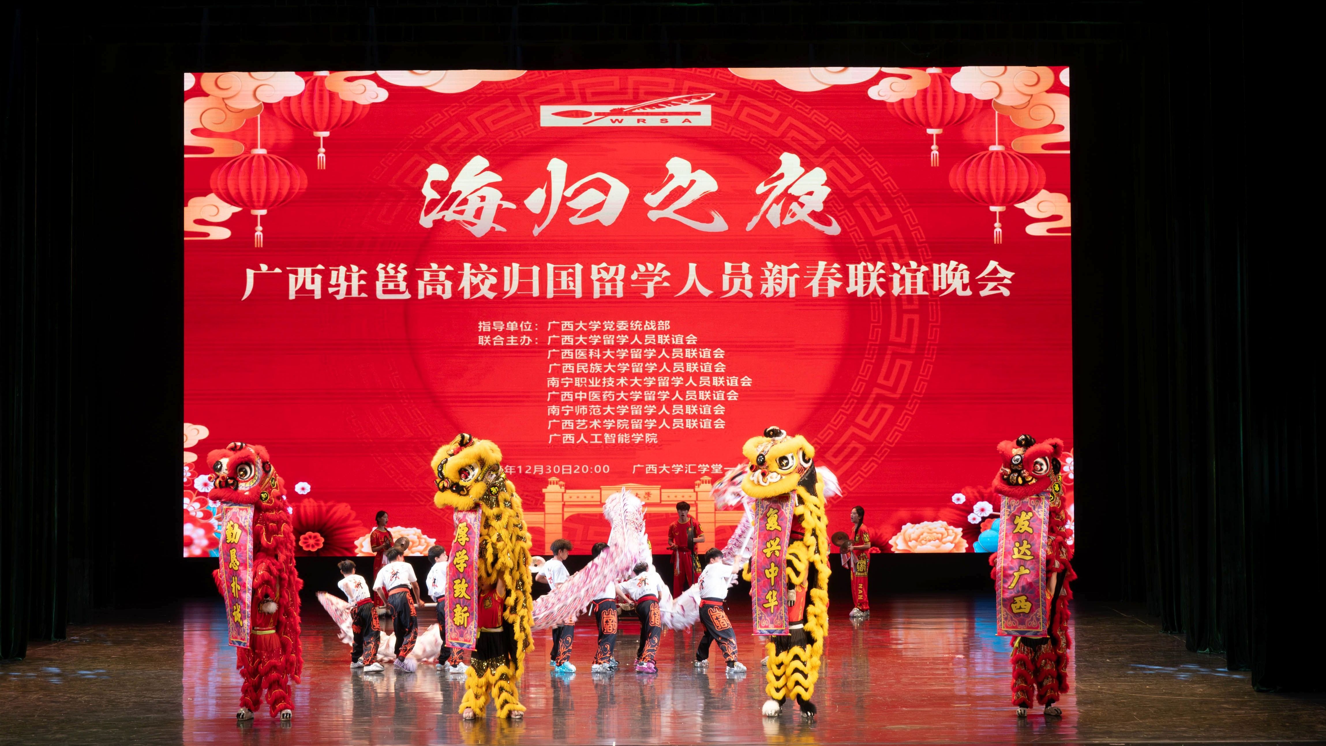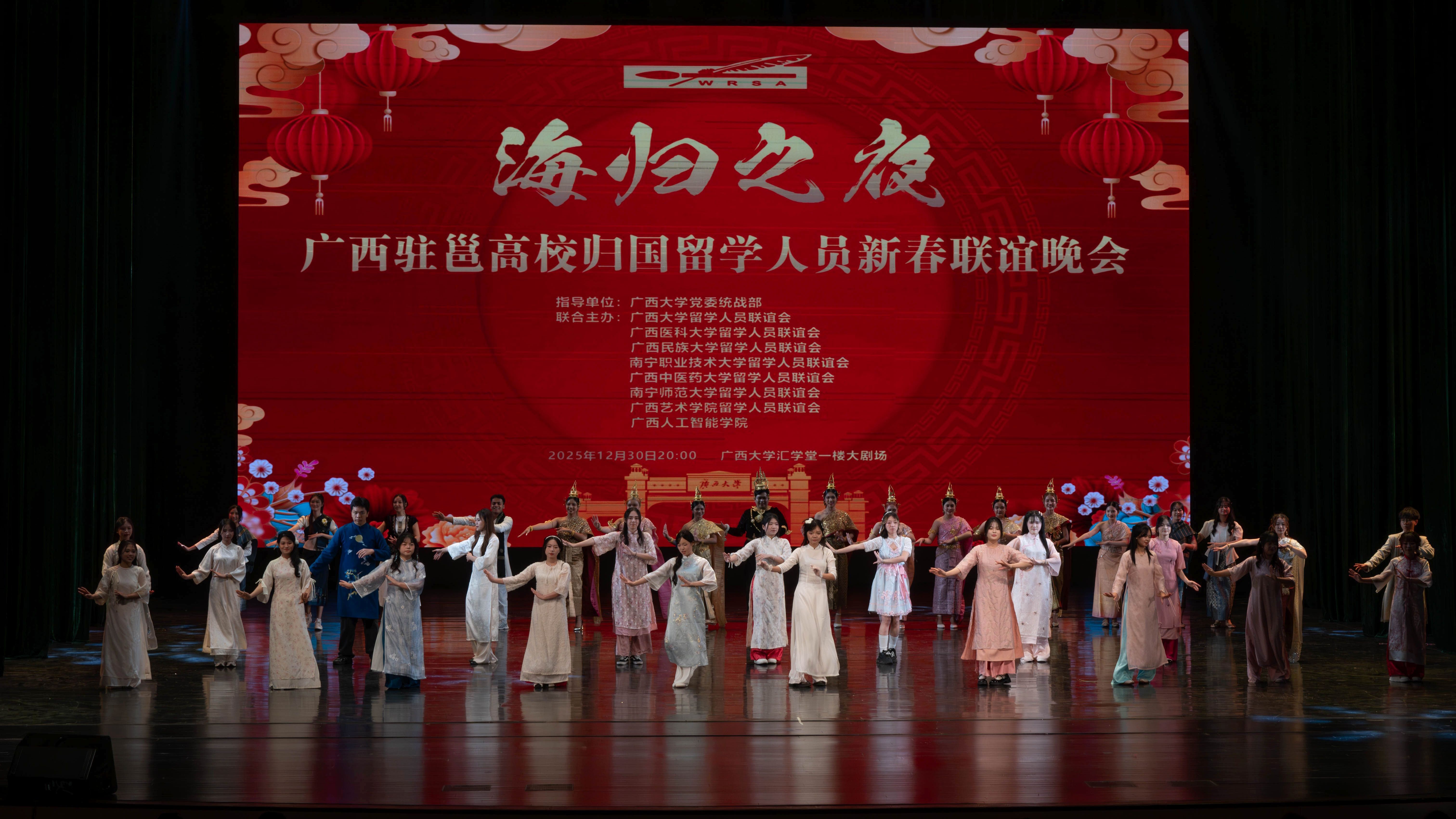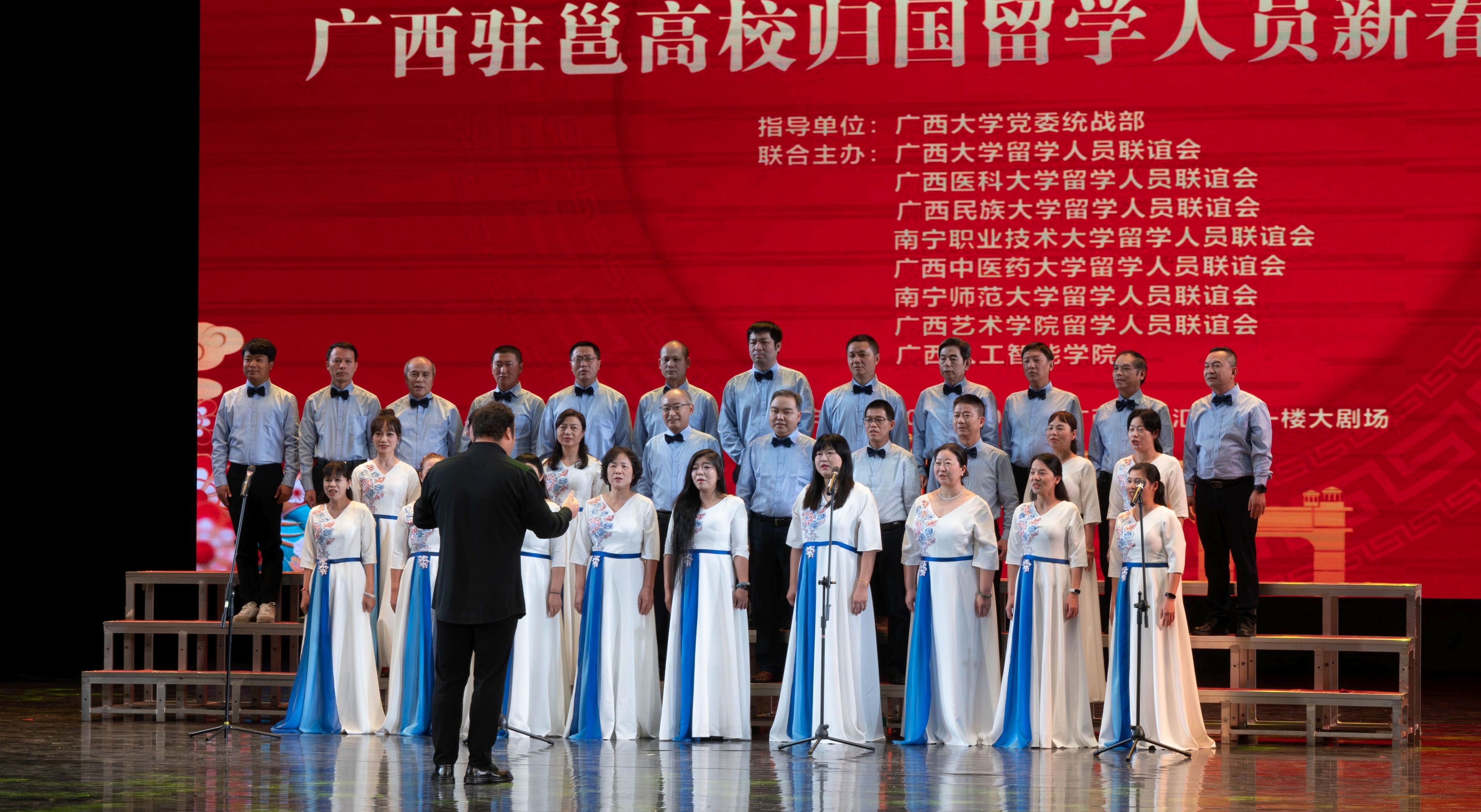 12月30日,由beats365(中国区)-唯一官方网站党委统战部指导,beats365(中国区)-唯一官方网站留学人员联谊会、广西医科大学留学人员联谊会、广西民族大学留学人员联谊会、南宁职业技术大学留学人员联谊会、广西中医药大学留学人员联谊会、南宁师范大学留学人员联谊会、广西艺术学院留学人员联谊会、广西人工智能学院联合主办的广西驻邕高校归国留学人员新春联谊晚会在beats365(中国区)-唯一官方网站汇学堂举行。自治区民宗委副主任邓娟娟出席晚会。beats365(中国区)-唯一官方网站党委副书记、校长肖建庄,南宁职业技术大学党委书记蹇兴超,beats365(中国区)-唯一官方网站党委副书记宁旭初、留学人员联谊会会长冯家勋等出席晚会并登台表演节目。