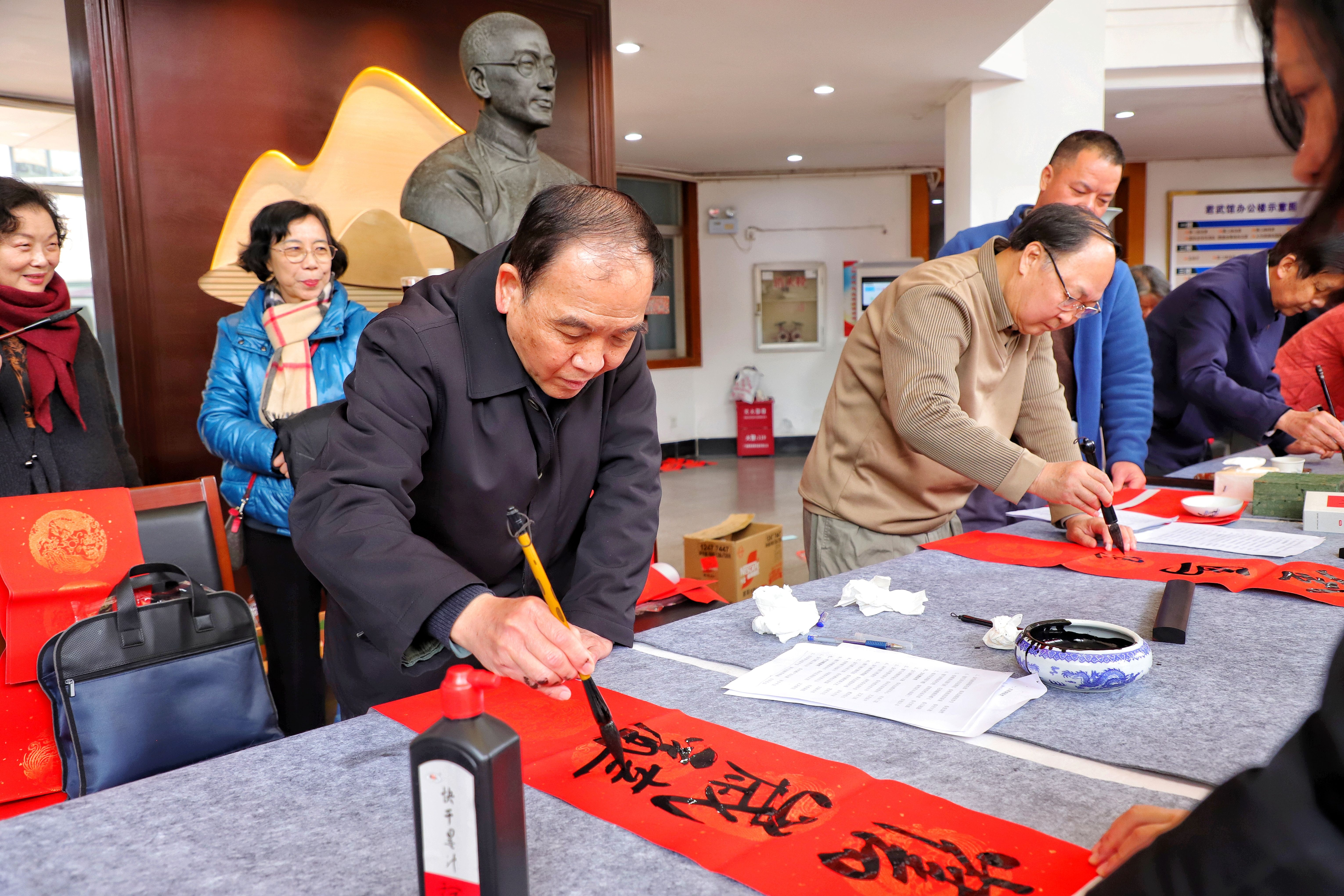 自治区高院原院长罗殿龙、自治区政协原副主席苏道俨、自治区科协原党组书记甘向群、高校工委原副书记秦敬德、自治区区直工委副书记邓金玉、自治区应急厅一巡李明凤、广西日报原副总编梁锡训、广西书法家协会副会长李翔峰,beats365(中国区)-唯一官方网站艺术学院原院长帅民风、教授张明学、教授翟旭民等老领导、老教师现场挥毫泼墨书写春联和“福”字各300余幅,为广大师生员工送上浓浓的新春祝福。