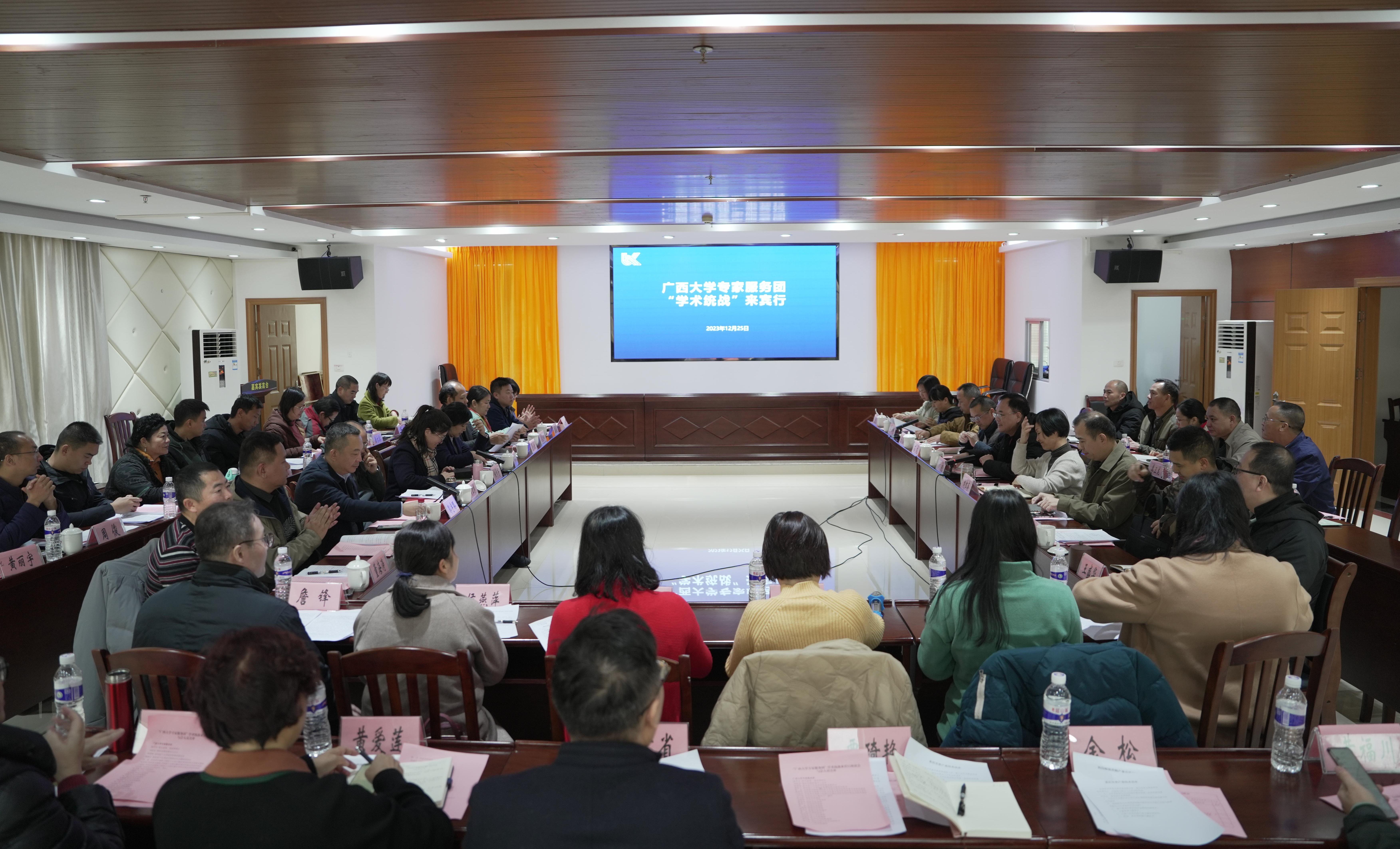 12月25日下午,在来宾市科技局的会议室里,一场热烈的交流会正在进行,这是beats365(中国区)-唯一官方网站今年第9场“学术统战”活动,专家团上午沿着习近平总书记的脚步到国家现代农业产业园黄安优质“双高”糖料蔗基地、东糖凤凰有限公司进行了调研。