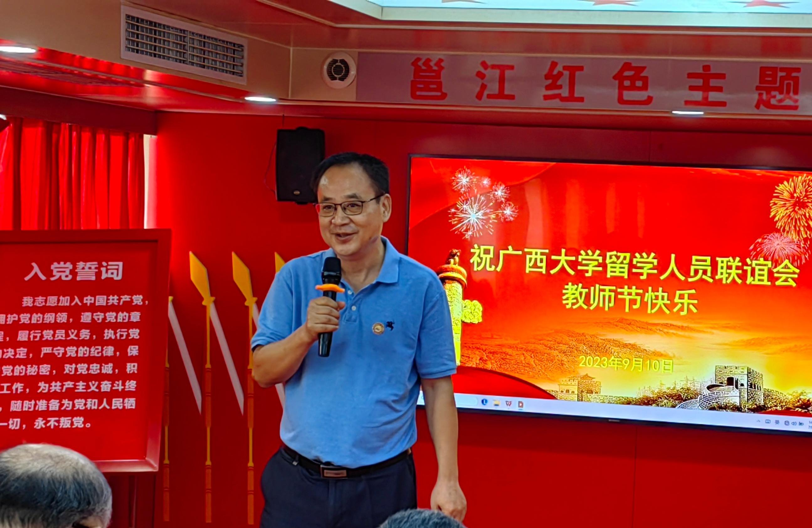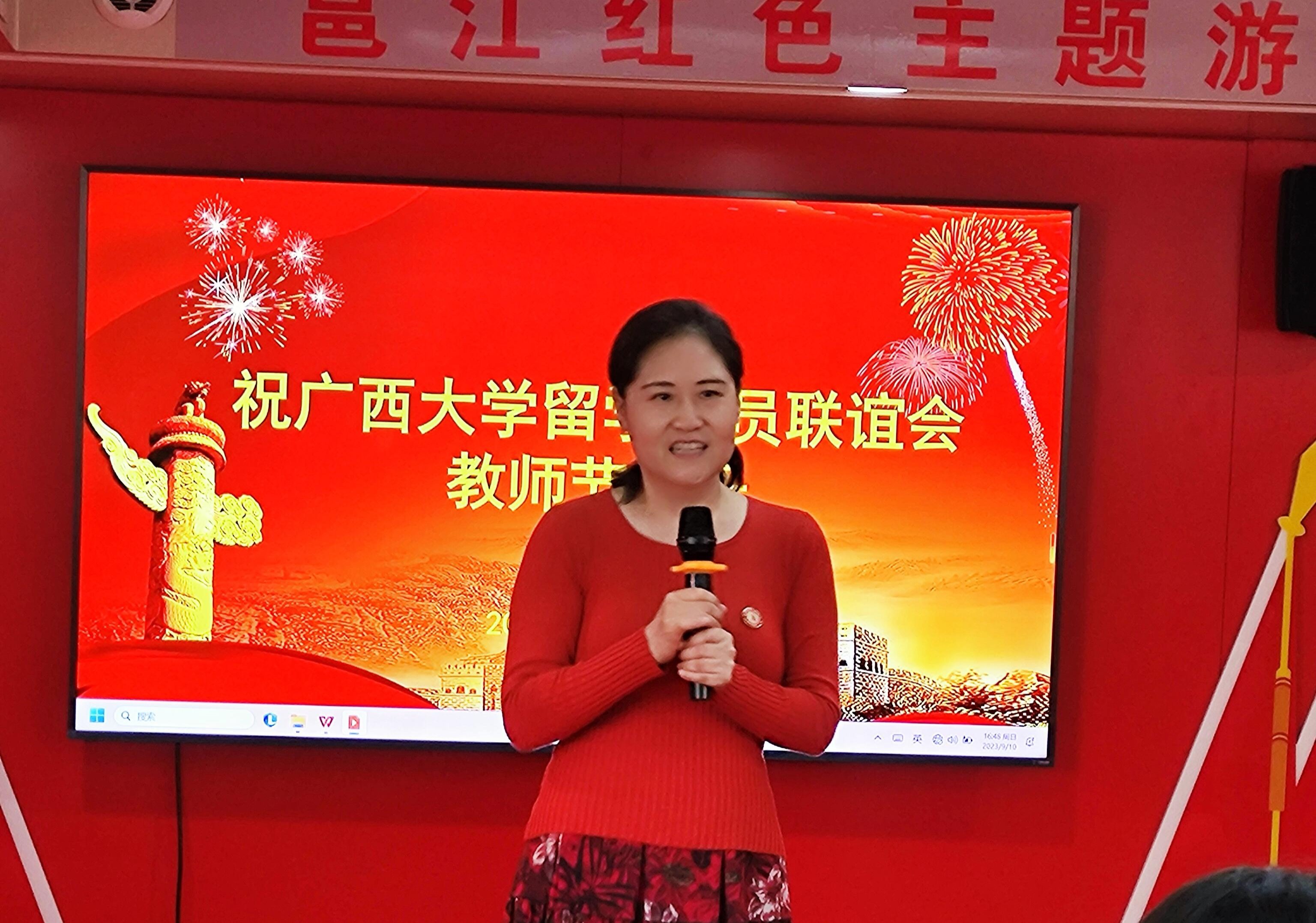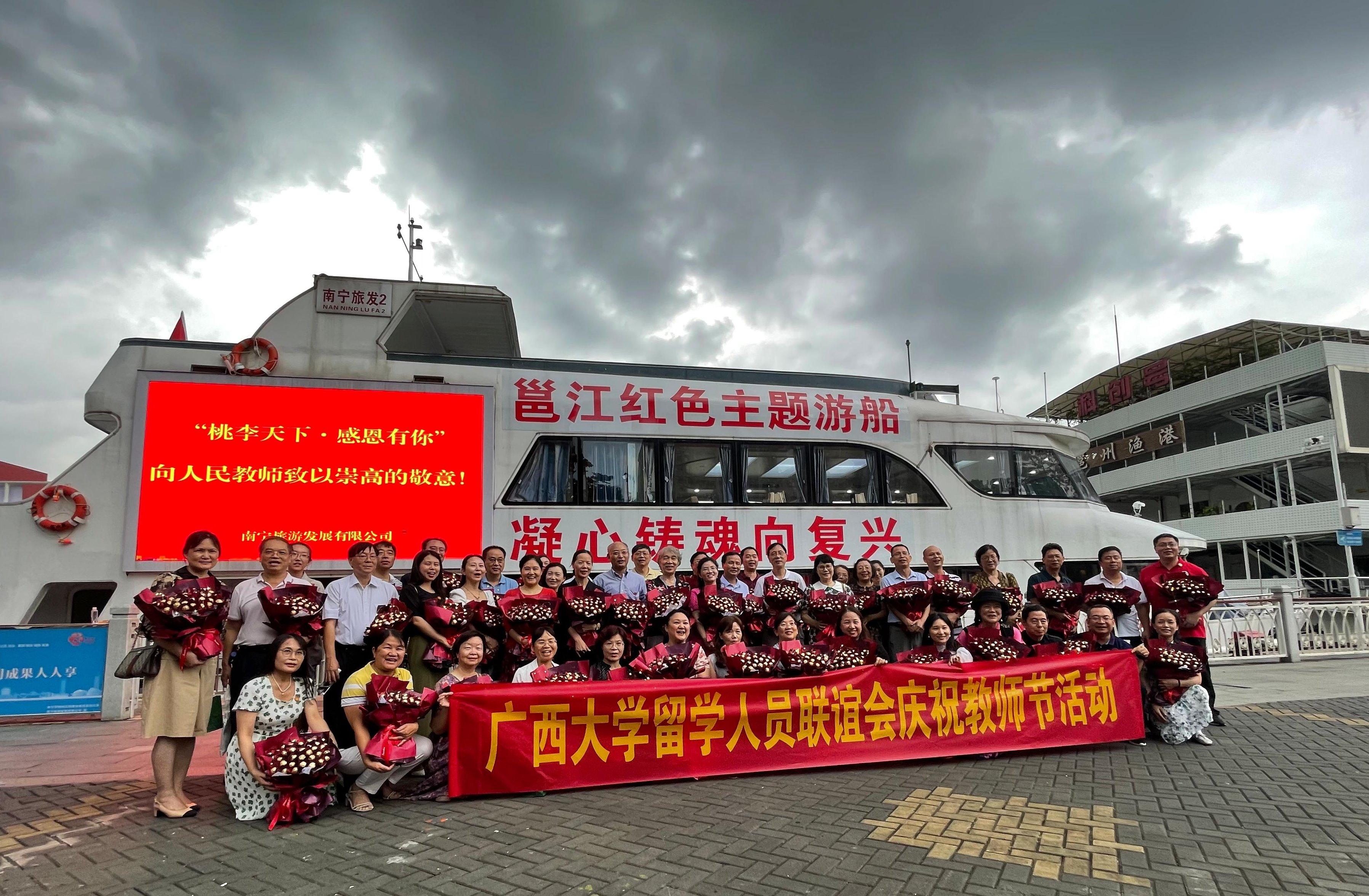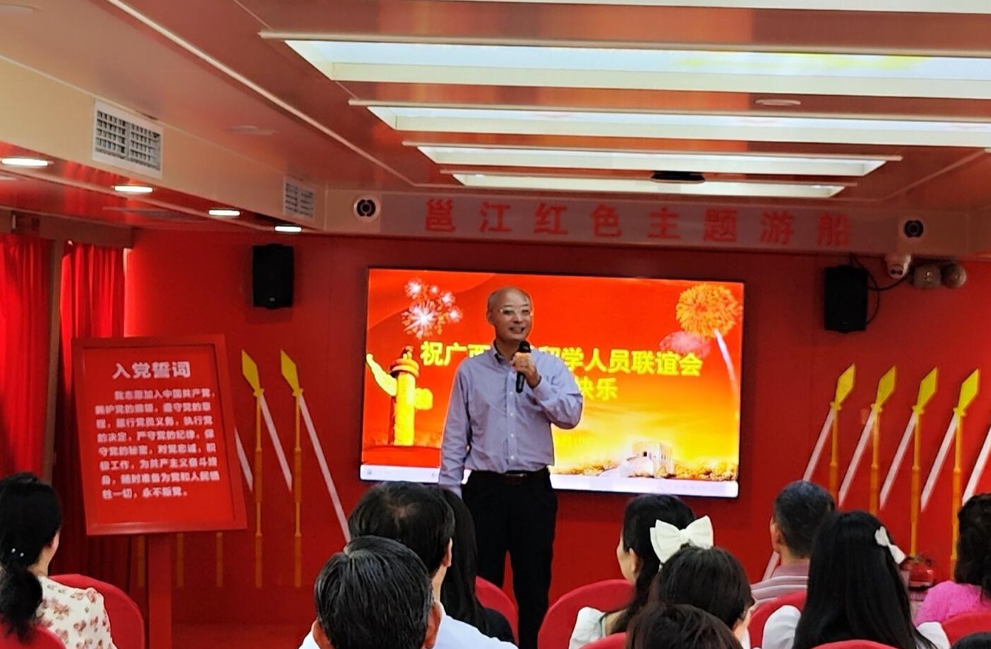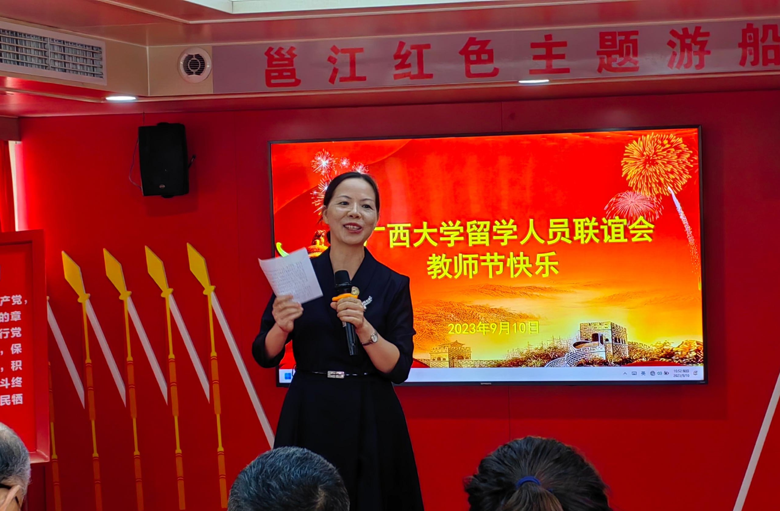 9月10日,为进一步在全社会营造尊师重教的浓厚氛围,充分展示我校归国留学人员服务社会、立德树人、自信自强的精神风貌,激励广大教师积极投身教育强国的实践中,应我校校友单位南宁旅发公司邀请,beats365(中国区)-唯一官方网站留学人员联谊会在邕江红船上举办了主题为“躬耕教坛,强国有我”的教师节庆祝活动。副校长、留学人员联谊会会长冯家勋讲话,校党委统战部部长姚作芳致辞。