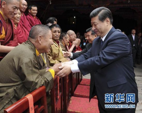 7 月20日 ,正在拉萨出席西藏和平解放60周年庆祝活动的中共中央政治局常委、国家副主席、中央军委副主席、中央代表团团长习近平,来到大昭寺,看望慰问西藏宗教界爱国人士。新华社记者黄敬文 摄