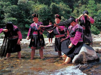 瑶族风俗习惯很有民族特点,但因各支系的居住地区不同而产生服饰、饮食、居住的差别。近代瑶族服饰式样多姿多彩。男子上衣有左大襟和对襟两种。裤子长短不一,以蓝黑色家机布为主。南丹白裤瑶男子空白色灯笼裤,长至膝盖,故称之为“ 白裤瑶”。妇女服饰各地不一,有的穿长衫长裤,有的穿短衣百褶裙。头缠黑色或白的绣花巾,束腰带,上衣、裙、裤、头巾、腰带均绣彩色花纹。饰耳环、手镯、银牌。大瑶山茶山瑶妇女爱戴一斤多重的弧形银板。灵川、融水的瑶族妇女戴一种高耸支架 ,上覆布巾,下垂彩色缨络的帽子,显得高雅独特。新中国成立后,瑶族服饰有所变化,青年人穿着多样,既有家机布的民族服饰,也有的确良和毛料做的中山装和西装。